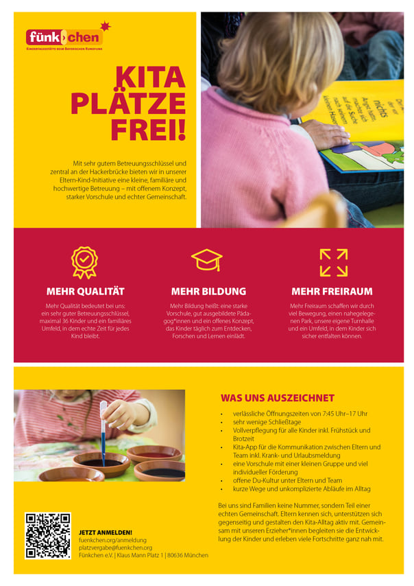 Die Elterninitiative Fünkchen e.V. betreibt für Kinder von Mitarbeitenden des Bayerischen Rundfunks eine Kindertagesstätte – gefördert durch den Freistaat Bayern gemeinsam mit der Stadt München und dem Bayerischen Rundfunk. Auch Kinder von Eltern, die nicht Mitarbeitende des Bayerischen Rundfunks sind, können einen Platz erhalten.